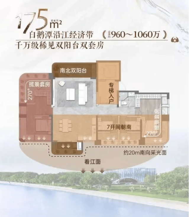 建面二百一十至二百一十五平方米的四房两厅三卫为双从套设想,配备家政间,很是适合二孩家庭,总价约一千五百万元起,为多代同堂的家庭供给了宽敞舒服的栖身空间。建面二百九十五平方米的天际大平层仅剩四套,两梯两户板式设想,五房三从套,俯瞰江景视野无敌,是城市塔尖人士的专属领地。此外,还有建面四百五十五平方米和五百八十五平方米的超大户型,一层一户,十三层小高层设想,二百七十度一线无遮挡江景,局部空间可定制,满脚终极置业需求,彰显了栖身者的卑贱身份取不凡品尝。